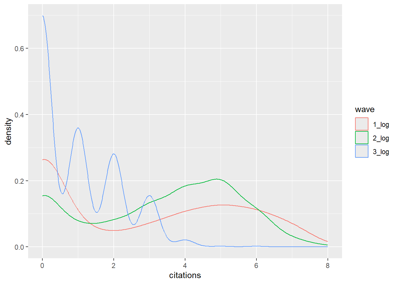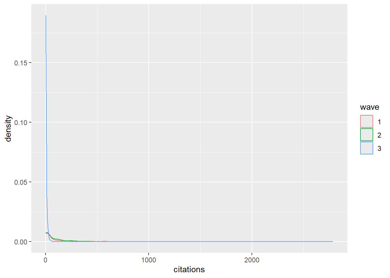 ggplot(df_long3, aes(x = citations, color = wave)) + geom_density()