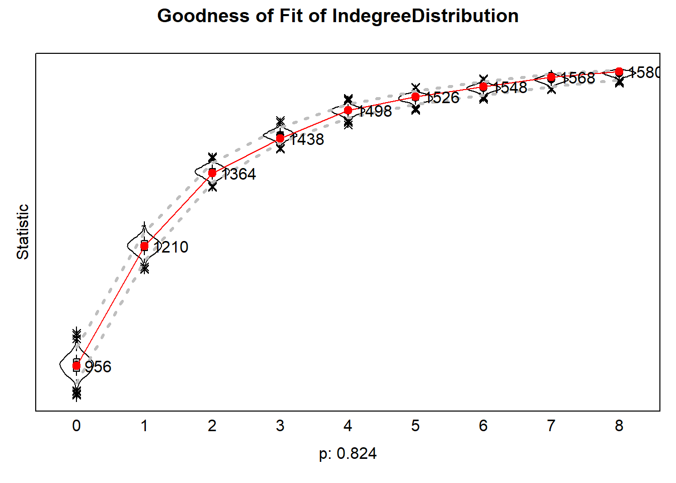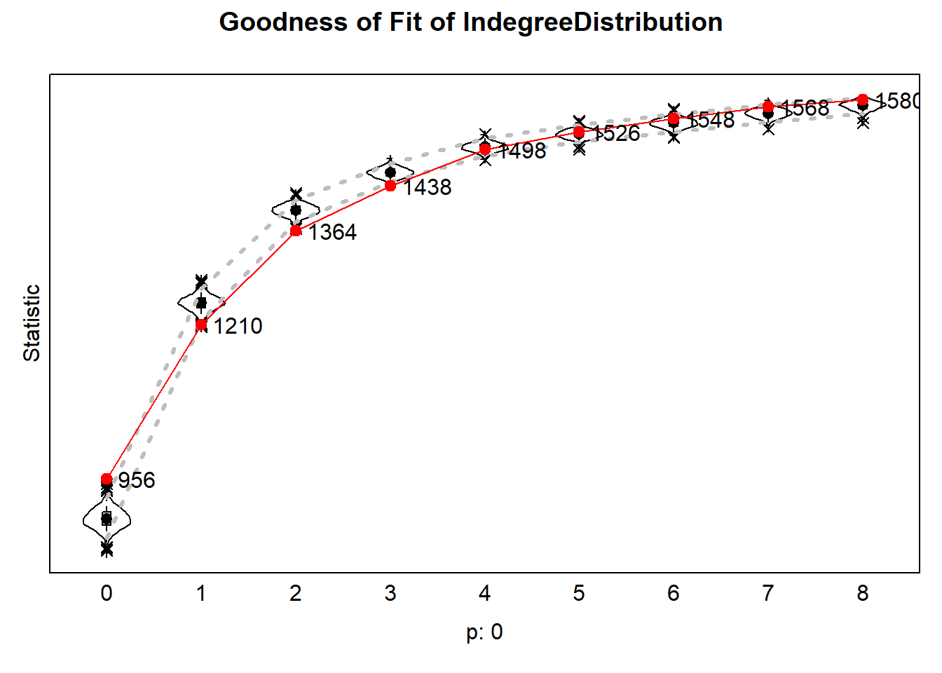 Now we run the model again with the ‘isolateNet’ effect added and check if the goodness of fit has improved. The results of this analysis show that the simulated networks match well with the observed network. This means that the goodness of fit is adequate and we can move on the interpreting the results of the model.