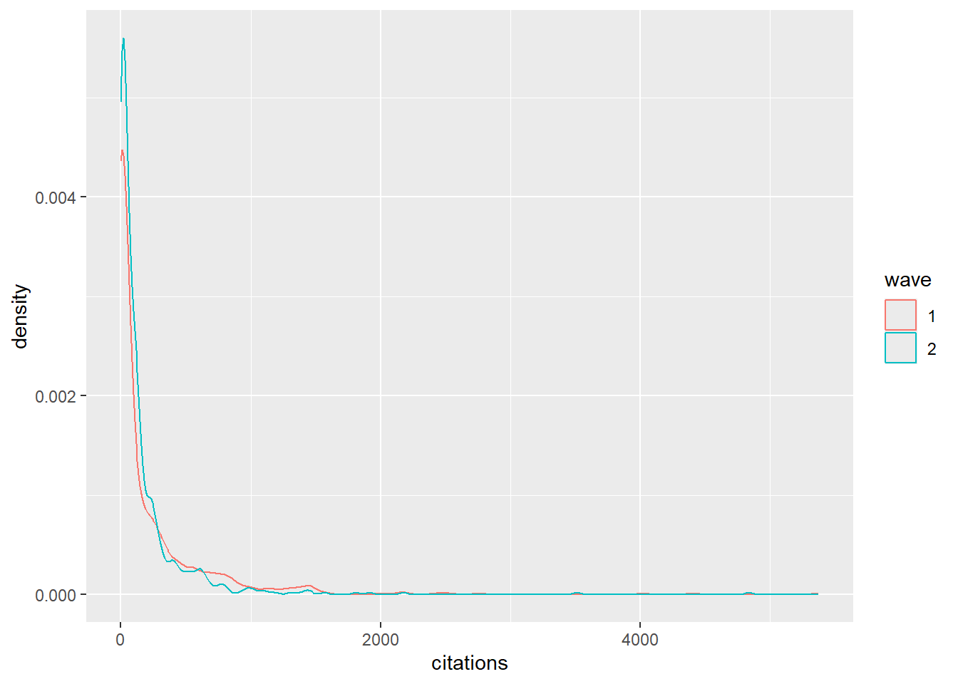 ggplot(df_long, aes(x = citations, color = wave)) + geom_density()